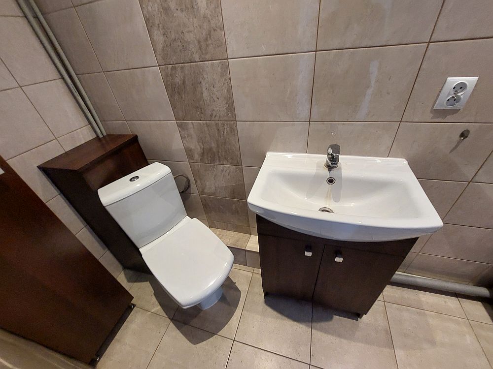 W łazience kabina natryskowa, umywalka i WC. Położona glazura i terakota.