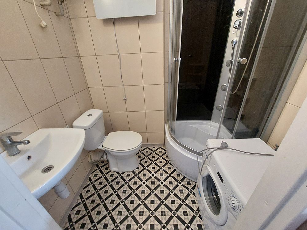 W łazience kabina natryskowa, umywalka, WC i pralka.