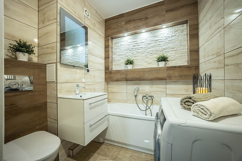 Łazienka z wanną, umywalką, toaletą i pralką.