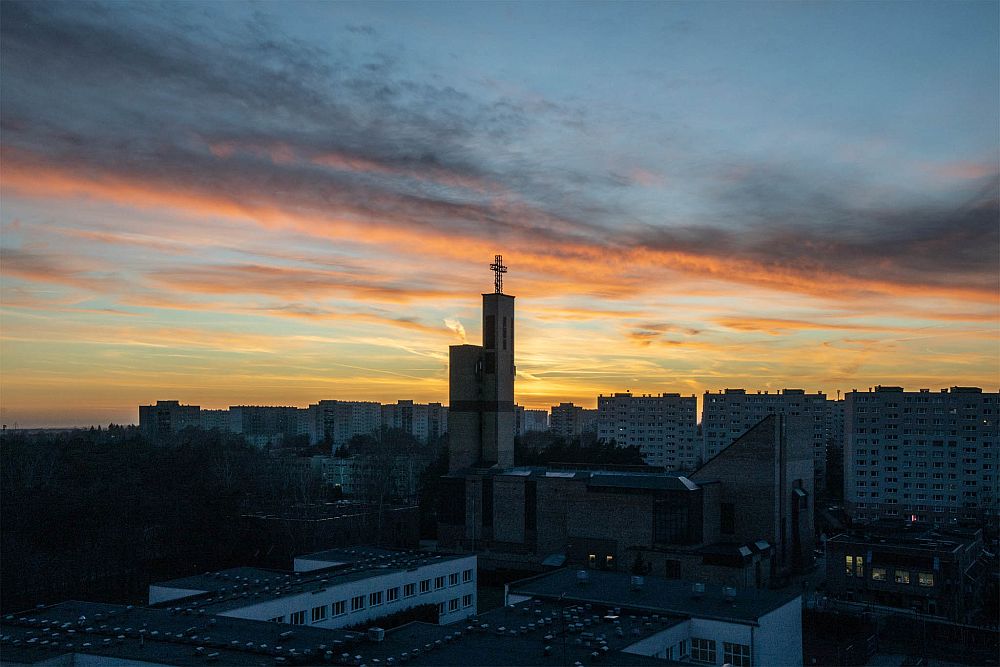 Dzięki ekspozycji wschód–zachód mieszkanie jest bardzo jasne przez cały dzień, a z okien rozciąga się widok na panoramę miasta.