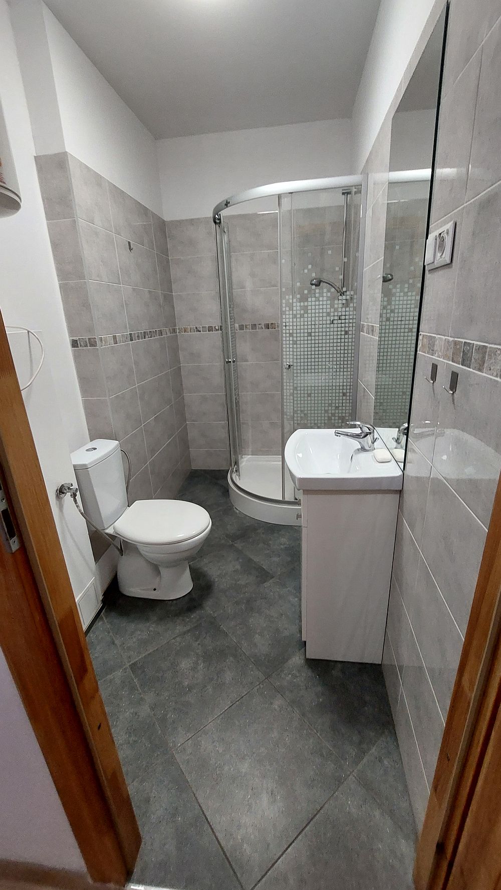 W łazience zamontowana kabina natryskowa, umywalka i toaleta.