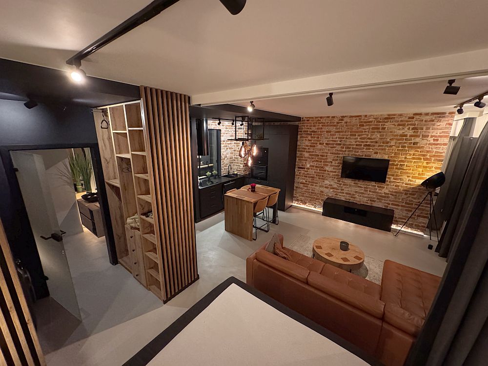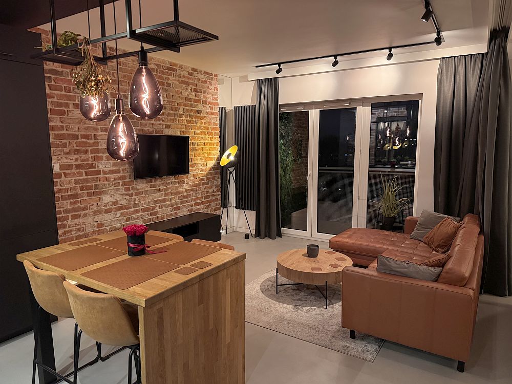 Przytulna strefa wypoczynkowa z wygodną sofą, miękkim dywanem, TV i klimatycznym oświetleniem. Cegła, drewno i czarne akcenty tworzą spójny, loftowy charakter wnętrza.