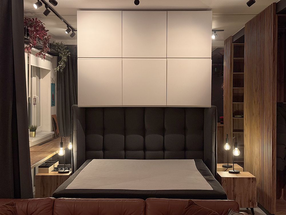 Komfortowe łóżko z tapicerowanym zagłówkiem i pojemnikami do przechowywania. Nad łóżkiem pojemne szafki. Przy oknie – stałe biurko z litego drewna, idealne do pracy zdalnej.