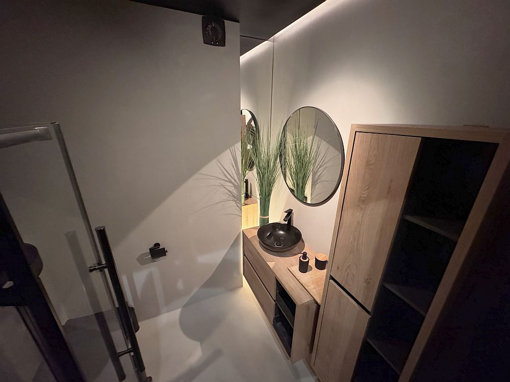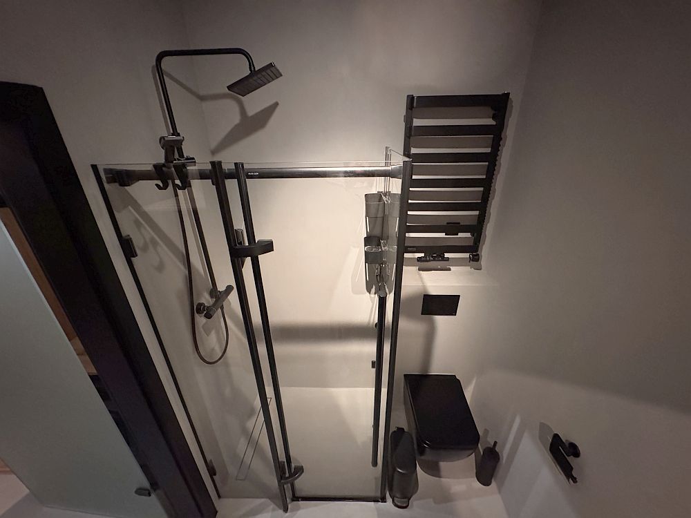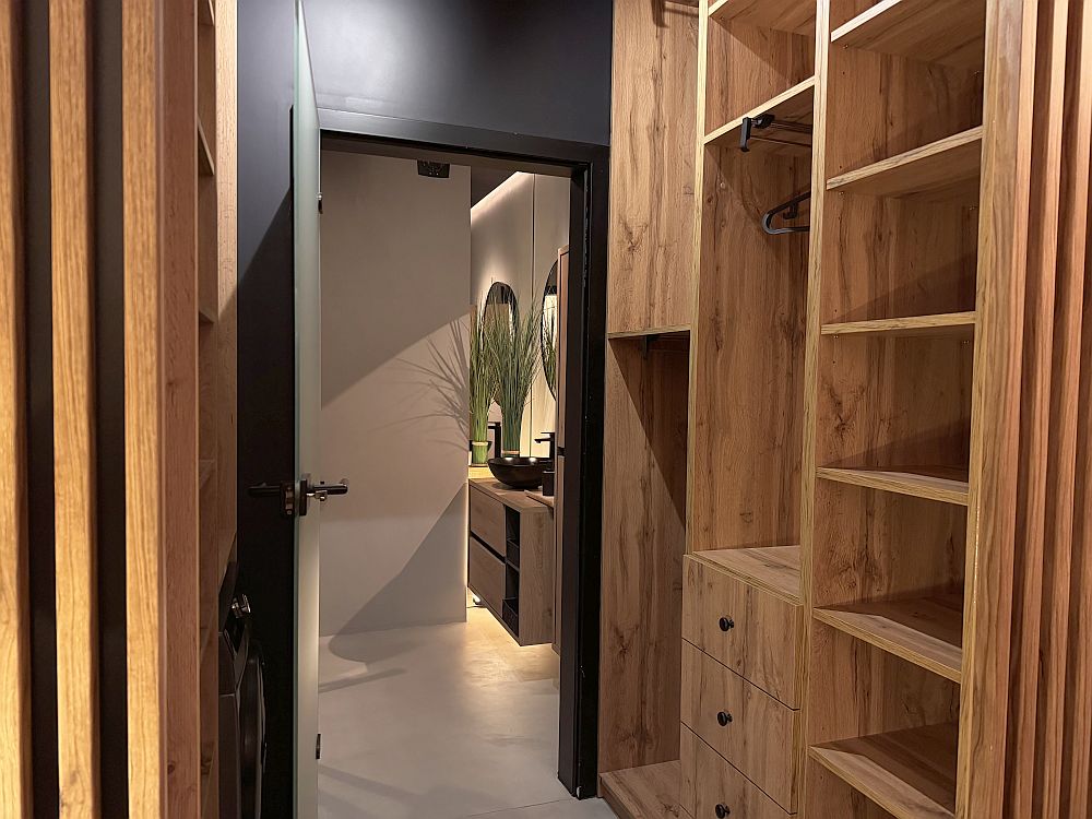 Nowoczesna, elegancka, z dużym lustrem i czarną armaturą. Prysznic typu walk-in. W garderobie – wbudowana pralko-suszarka Samsung.