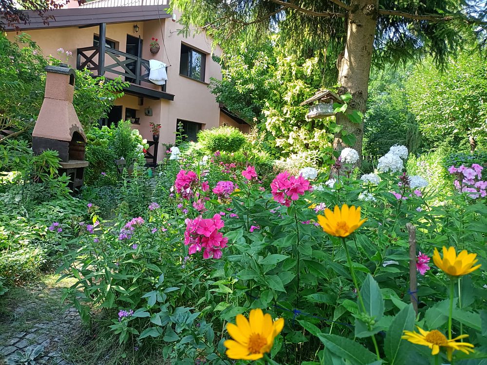 Ogromnym atutem jest działka o powierzchni 500 m² – pięknie zadrzewiona, pełna kwiatów i różnorodnych nasadzeń. Ogród zmienia swoje oblicze w rytmie pór roku, oferując bogactwo kolorów i zapachów. To przestrzeń, która zachwyca nie tylko latem, ale również wiosną, jesienią i zimą – zawsze stanowiąc idealne tło dla domu.