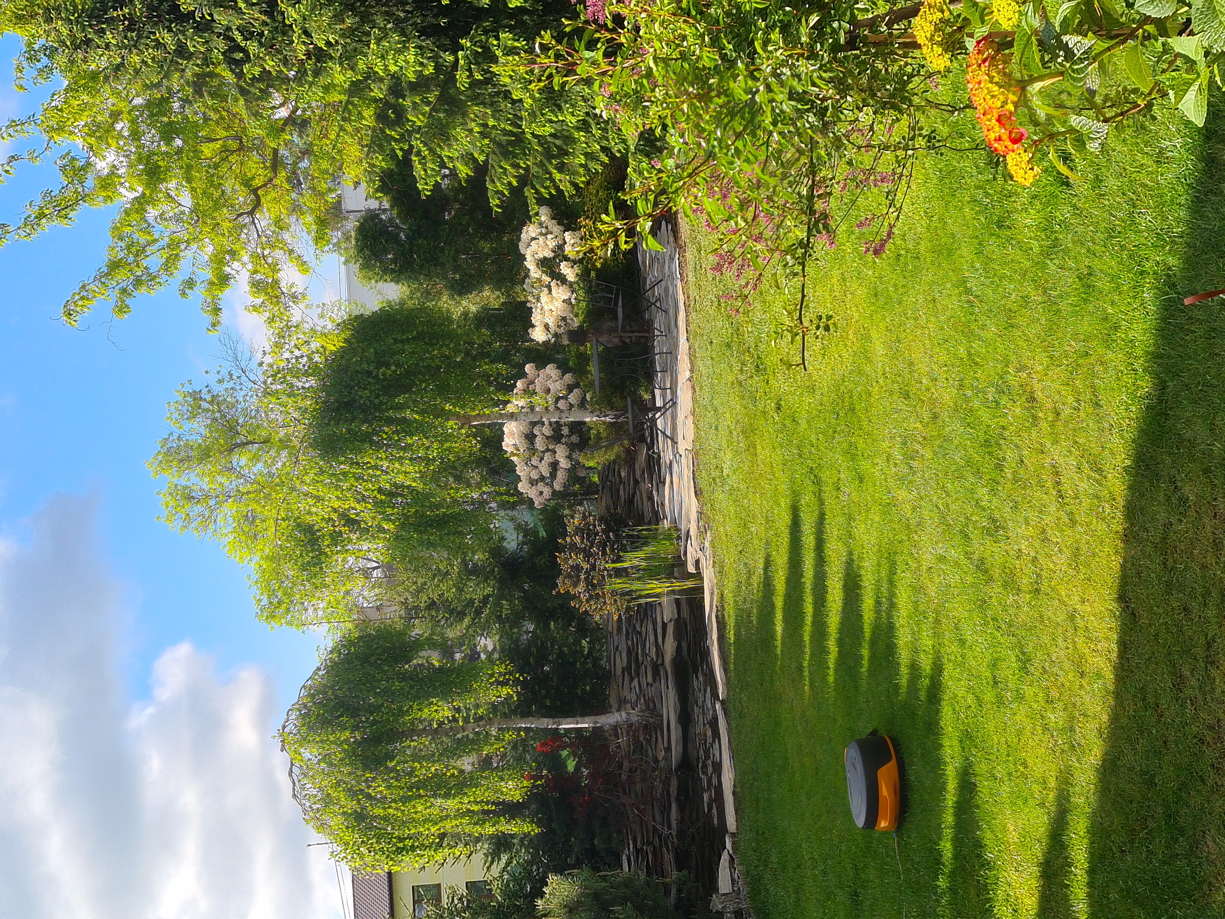 Dojrzały, starannie zaprojektowany ogród z wieloletnią roślinnością, oczkiem wodnym z systemem pomp i filtrów oraz automatycznym systemem nawadniania podłączonym do osobnego wodomierza.