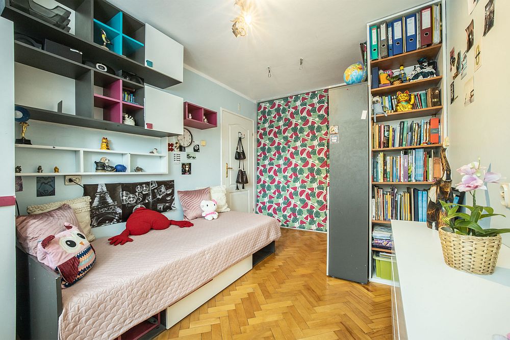 W mniejszym pokoju, za kolorową zabudową, znajdują się głębokie szafy zapewniające dużą ilość miejsca do przechowywania.