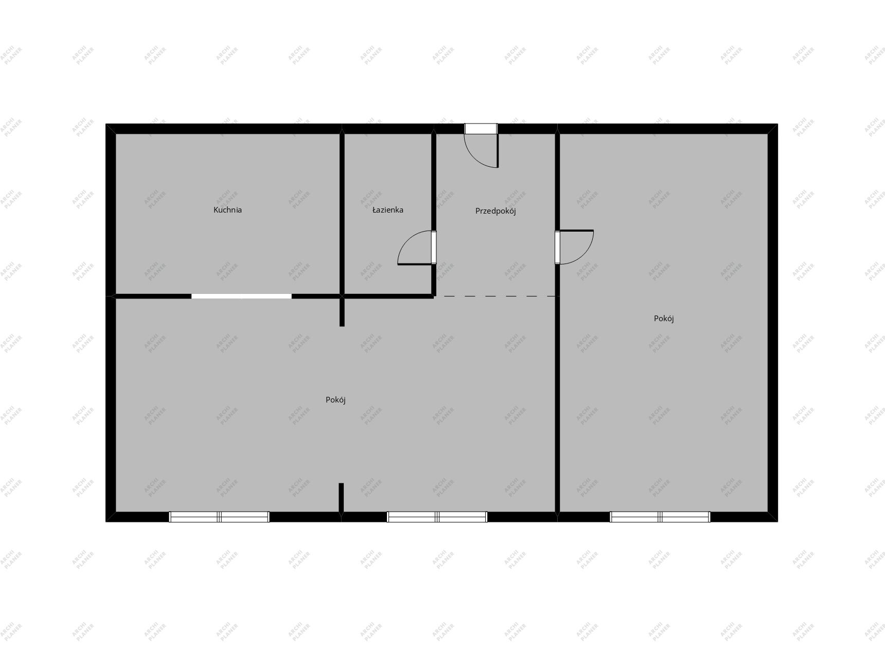 Układ pomieszczeń: jeden pokój jest niezależny (sypialnia), natomiast z drugiego – pełniącego funkcję salonu – wchodzimy bezpośrednio do oddzielnej kuchni (bez okna).