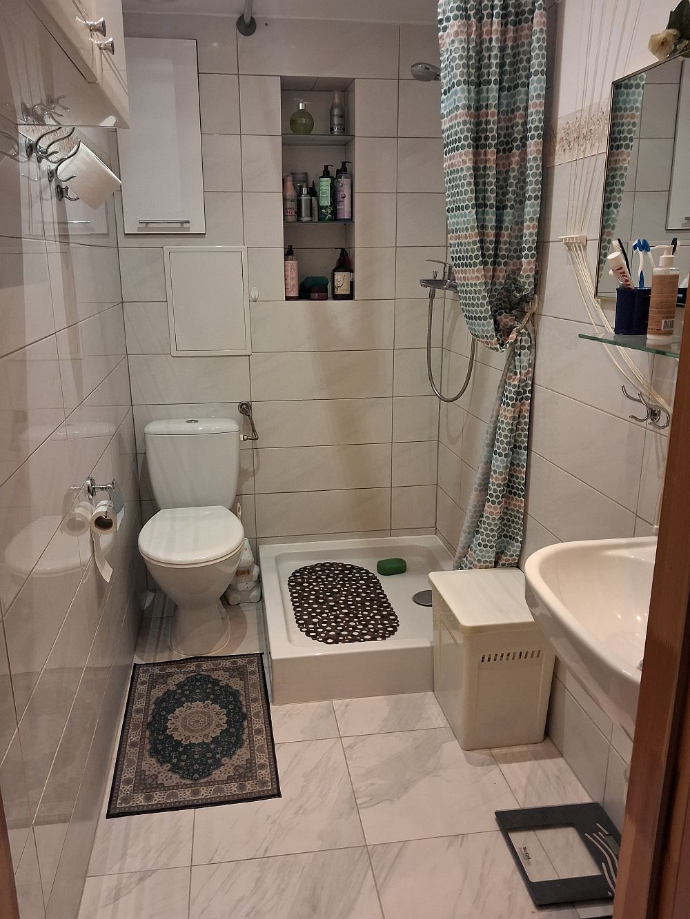Łazienka z toaletą oraz z oddzielnym miejscem na pralkę.